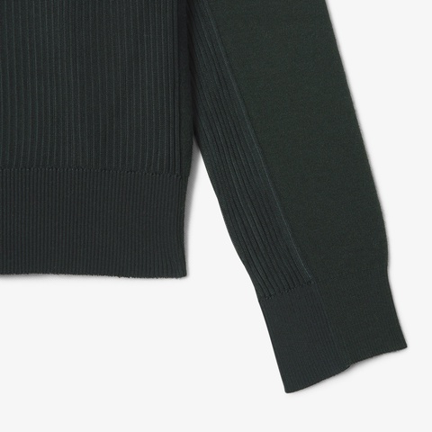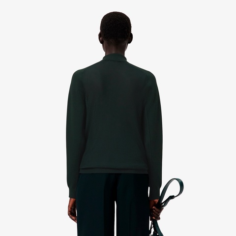 前後切り替えの大胆なデザインにエレガンスを纏うポロカラーニットセーター