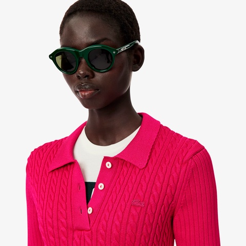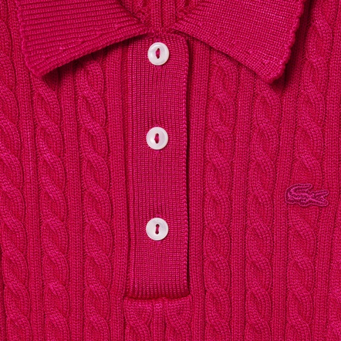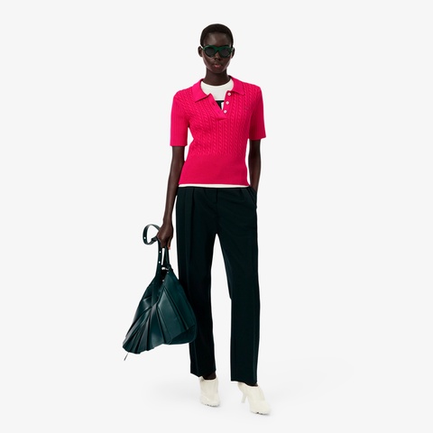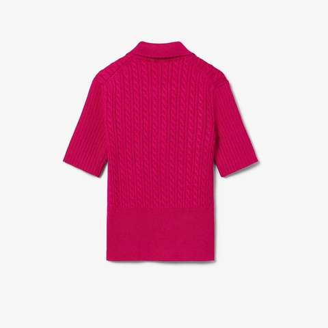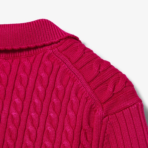 立体感あるケーブル編みで上品に仕上げたランウェイデザインのポロカラーニット
