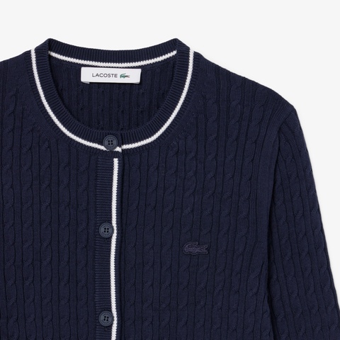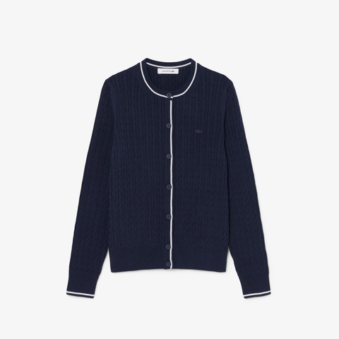 さりげない配色ラインが映える、クラシックなケーブルニットカーディガン