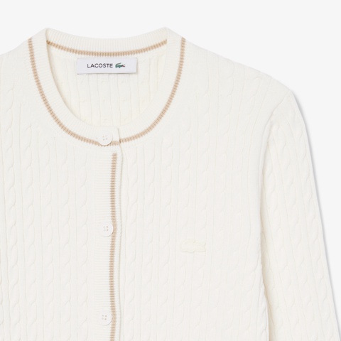 さりげない配色ラインが映える、クラシックなケーブルニットカーディガン
