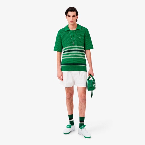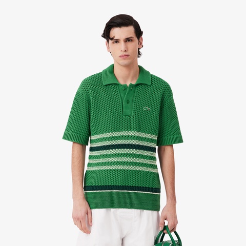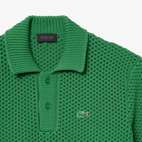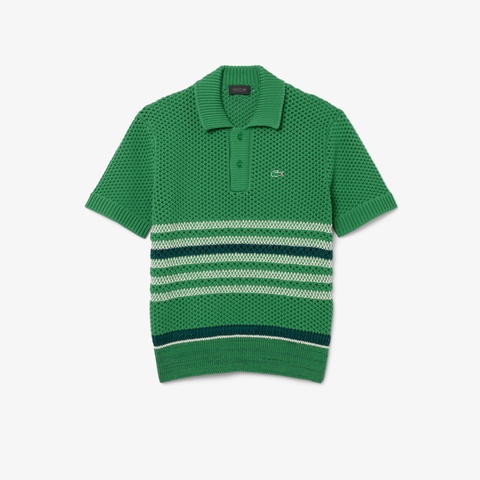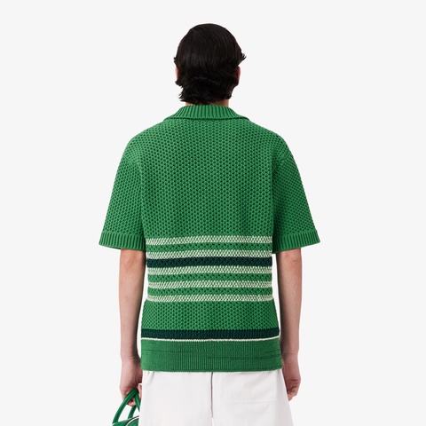 透かし柄のダブルフェイスニットにボーダーを効かせたランウェイポロカラーセーター