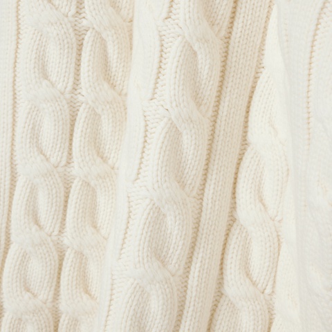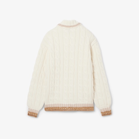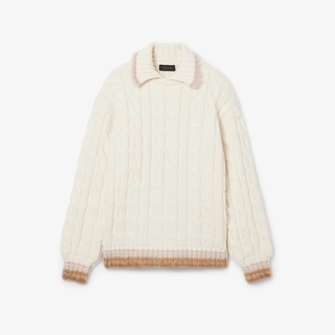 シャギー仕立てのリブニットがアクセントとして機能するケーブルニットポロカラーセーター