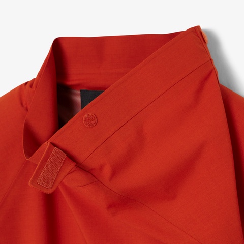 ・斜めにフラップを配した、スナップボタン+面ファスナーのハイネックデザイン