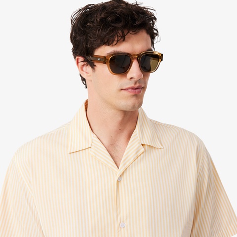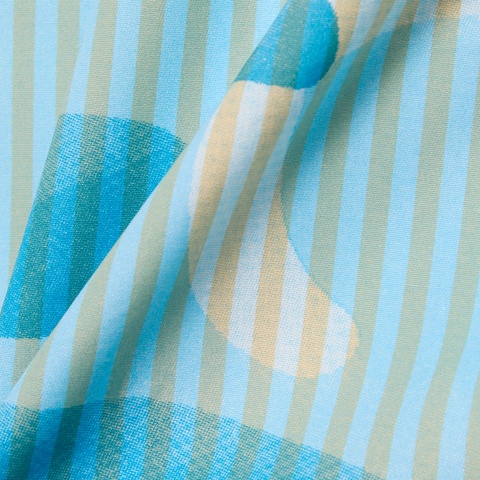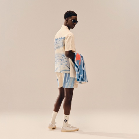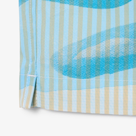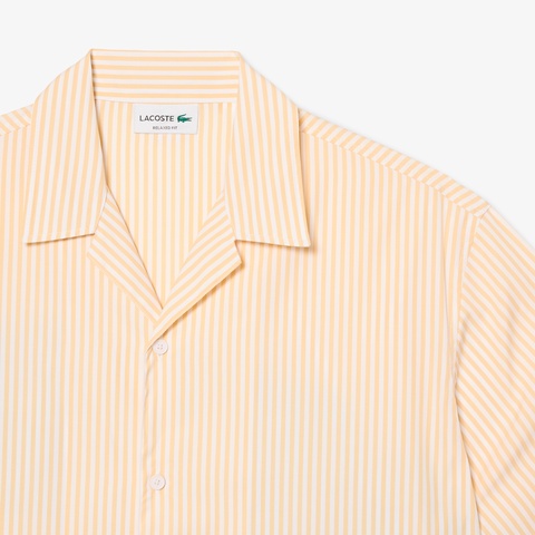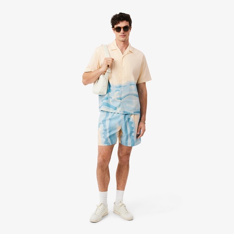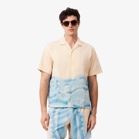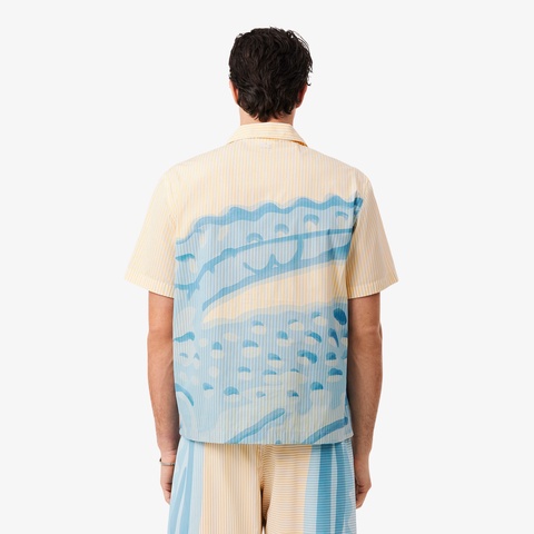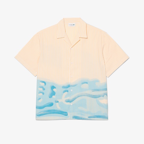 爽やかなストライプに大胆なグラフィックが映える、開襟デザインの半袖シャツ