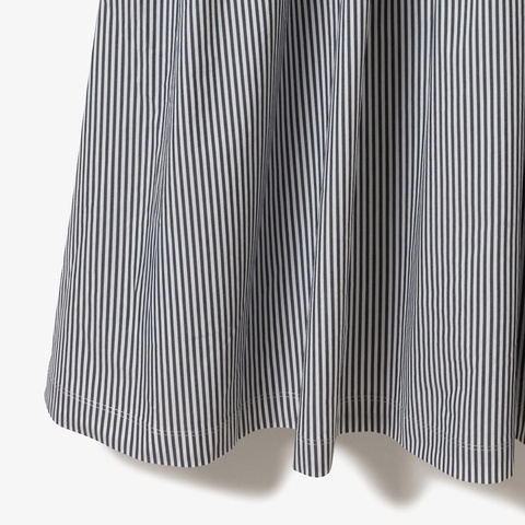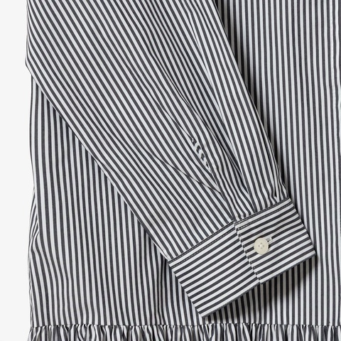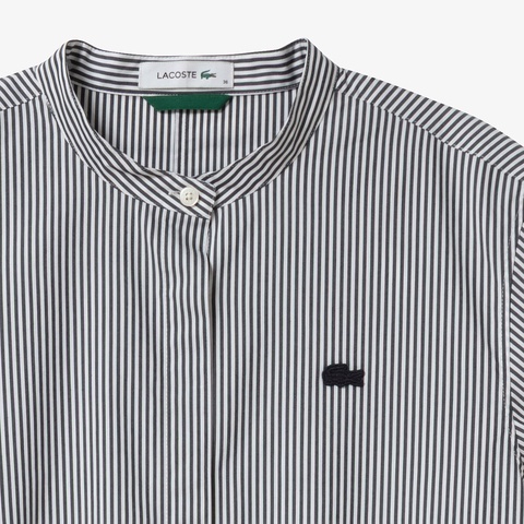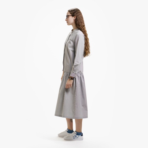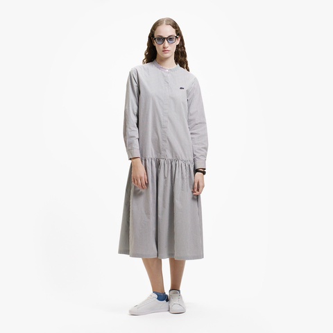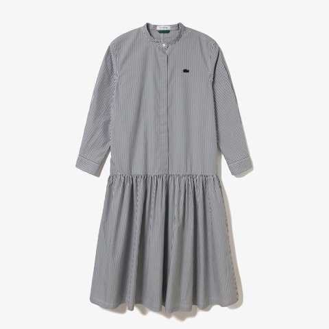 ローウエストの切り替えが特徴的な、ストライプ柄のバンドカラーロングシャツドレス