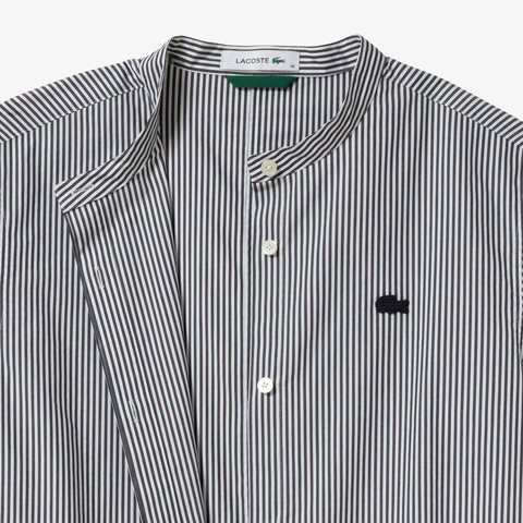 ・比翼仕立てでボタンを隠したバンドカラーシャツデザイン