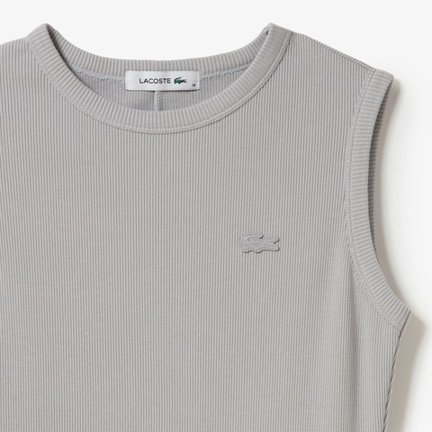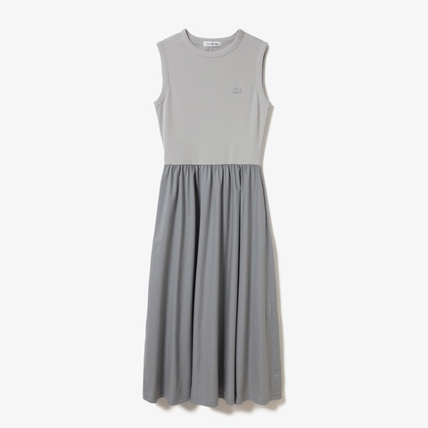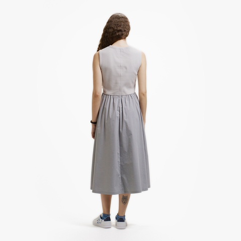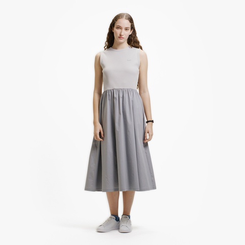 異素材コンビで魅せるフィット&フレアのノースリーブマキシドレス