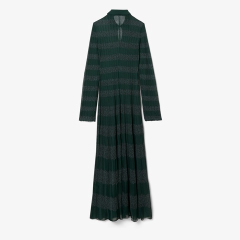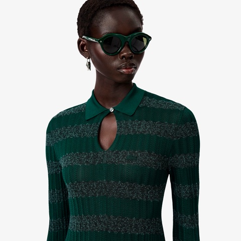 繊細な透かし編みでフェミニンに仕上げたランウェイポロカラーニットマキシドレス