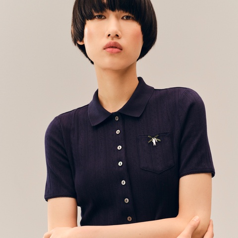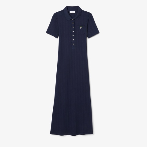 ブランドネームロゴモチーフを繊細な透かし編みで表現したロング丈ポロドレス
