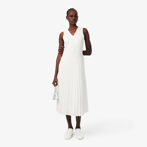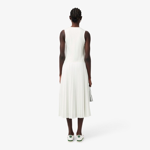 テニス由来のプリーツをエレガントにアレンジしたVネックスリーブレスロングドレス