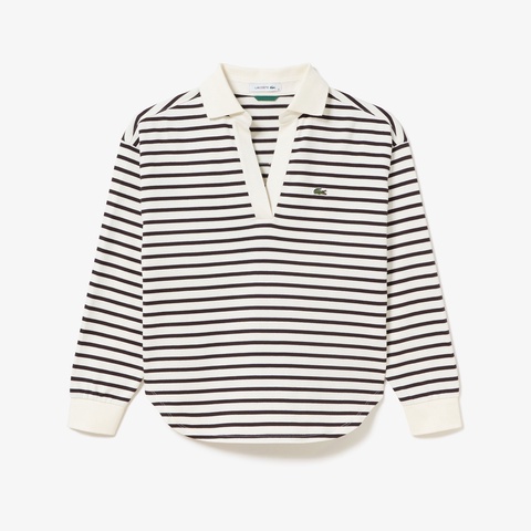 ・首周りと袖口を単色で切り替えたラガーシャツデザインを、女性的なスキッパーネックで