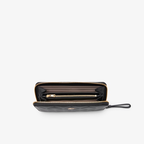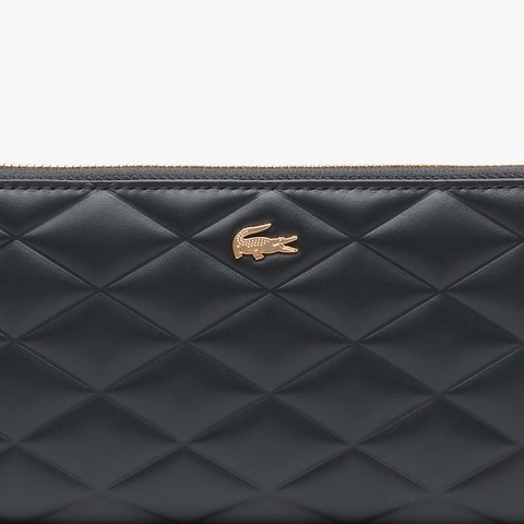エレガントなキルティングレザーにゴールドのワニロゴが映えるロングウォレット