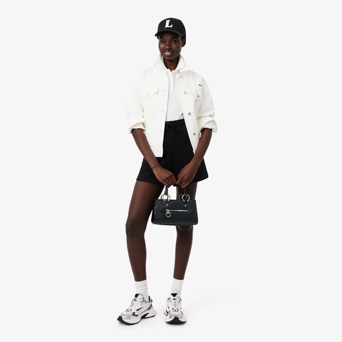 ワントーンのミニマルボディにメタルワニロゴが映えるスモールトップハンドルバッグ