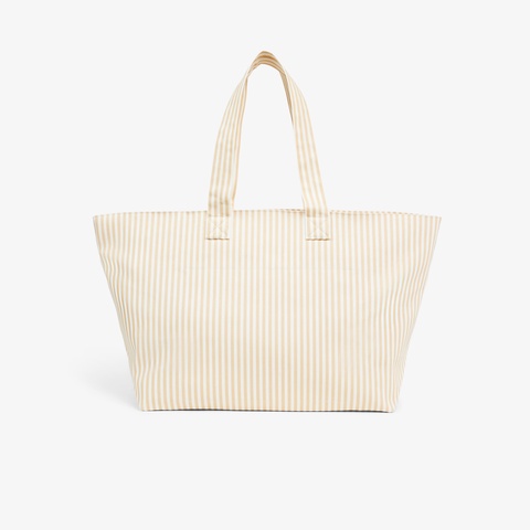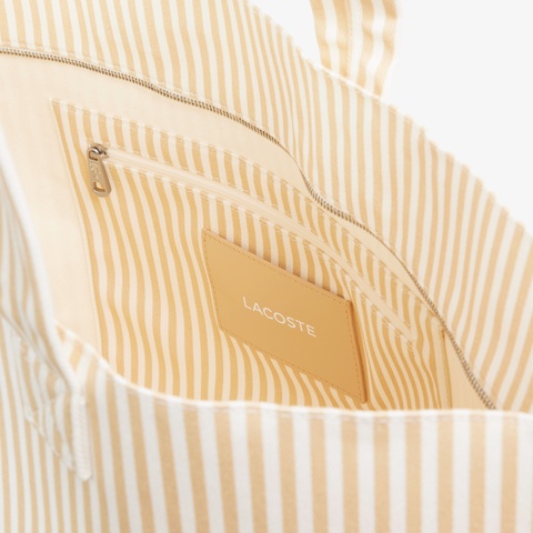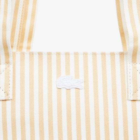 春夏らしいストライプ柄に大胆なワニロゴグラフィックが映えるたっぷり容量のトートバッグ