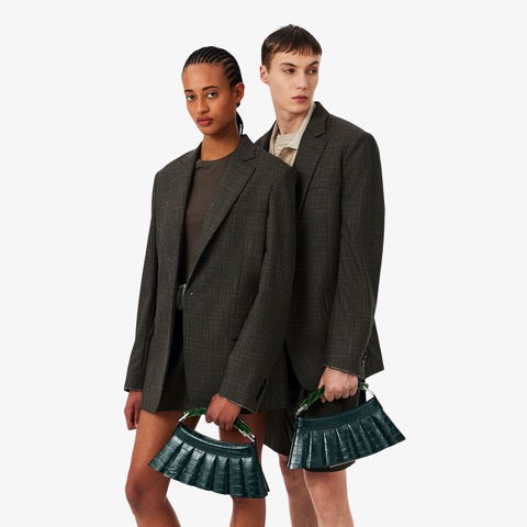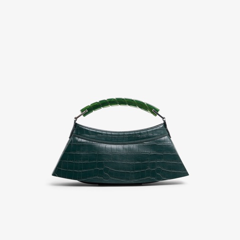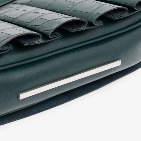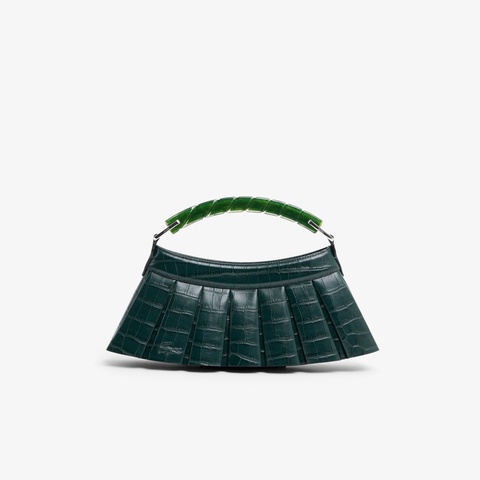 プリーツスカートを思わせる立体フォルムが映えるランウェイクロコ型押しレザーハンドバッグ