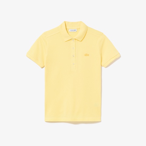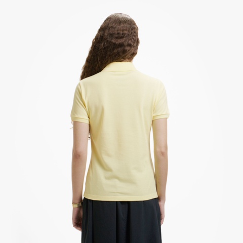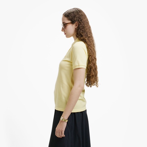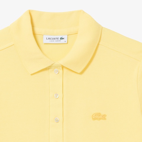 色合い鮮やかなストレッチコットンピケ素材を使用した、スリムフィットのポロシャツ。光沢感のある4ボタンのリブポロカラーを採用し、袖口もスポーティーなリブニット仕様に。左胸には象徴的なワニロゴパッチをレイアウト。オーセンティックなポロシャツをフェミニンに仕上げた1着です。