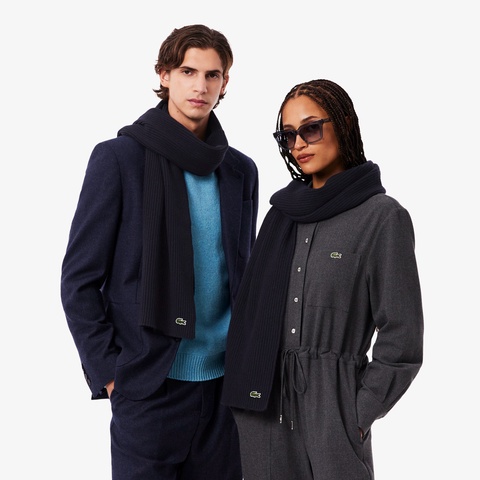 どんなシチュエーションにもマッチするワンポイントデザインのリブニットマフラー
