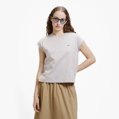 ・シンプルなクルーネックTシャツの肩口をキャップスリーブでフェミニンに