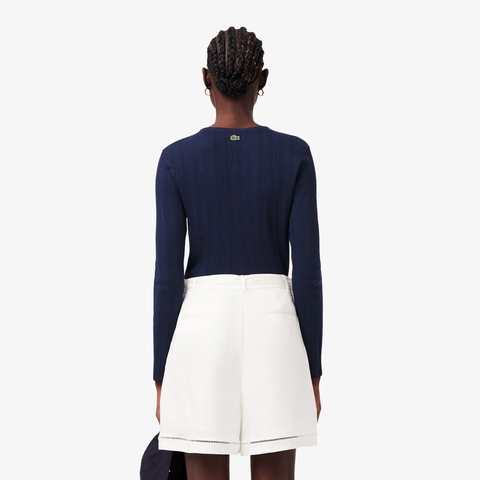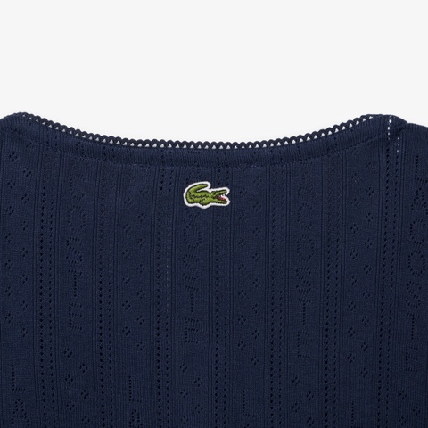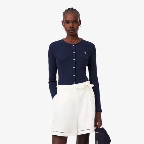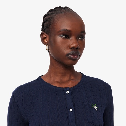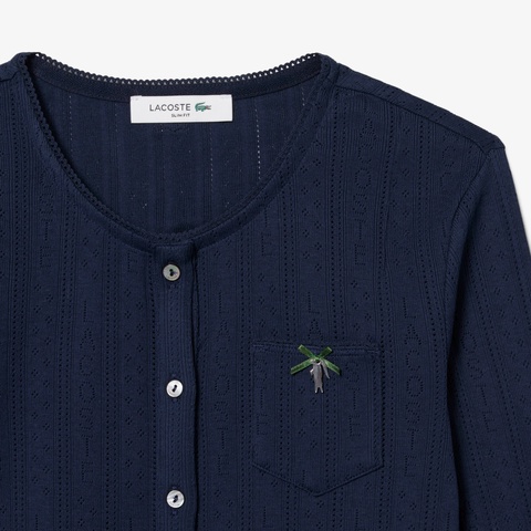 ブランドネームを織り込んだ透かし編みで仕上げたニットカーディガン